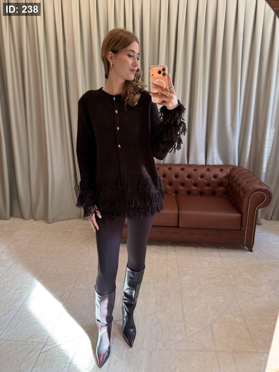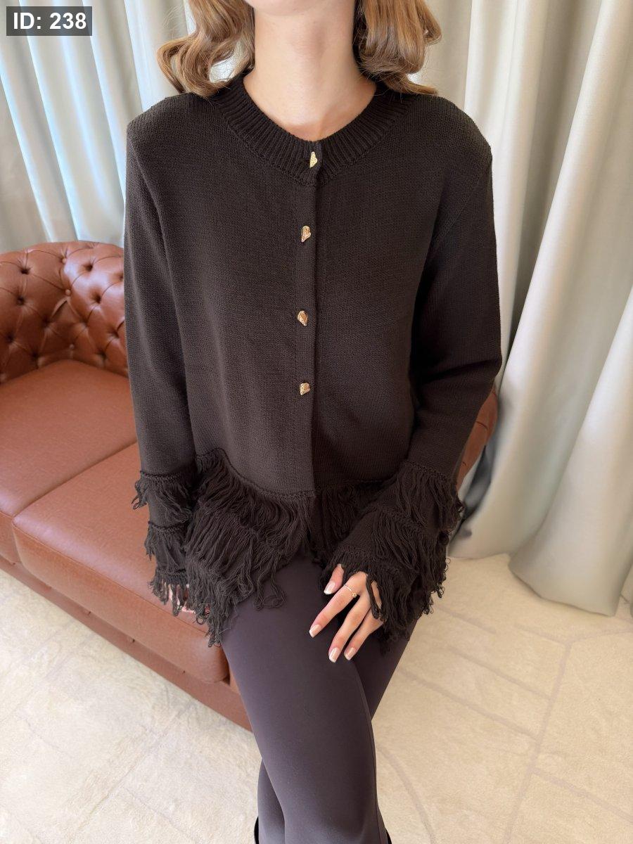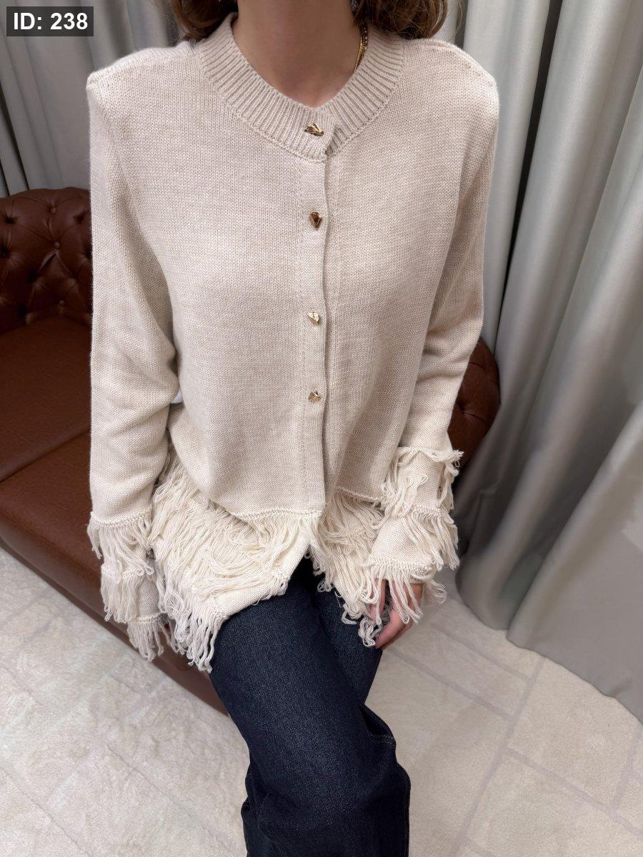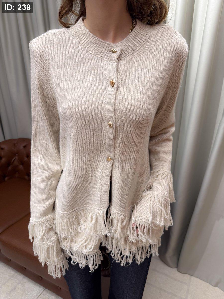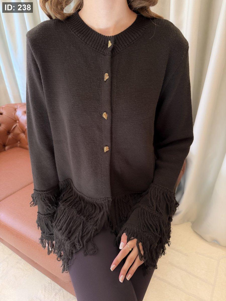 كارديغان تريكو ناعم بياقة دائرية وأكمام طويلة، مزوّد بأزرار أمامية معدنية تضيف لمسة أنثوية راقية. يتميّز بتفاصيل الشراشيب عند الأكمام والحافة السفلية، ما يمنحه طابعًا عصريًا أنيقًا ومختلفًا. قطعة مثالية للتنسيق مع الجينز أو البنطال القماشي لإطلالة كاجوال شيك ودافئة.