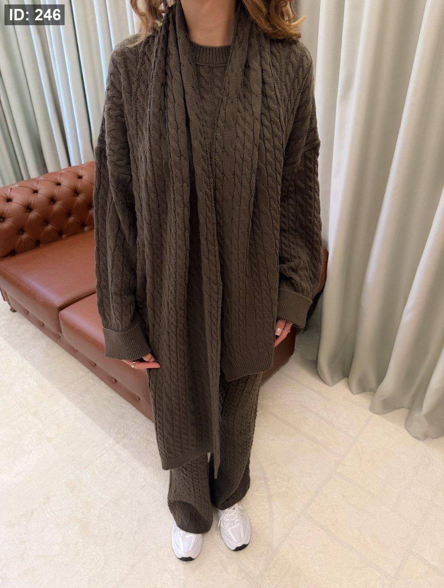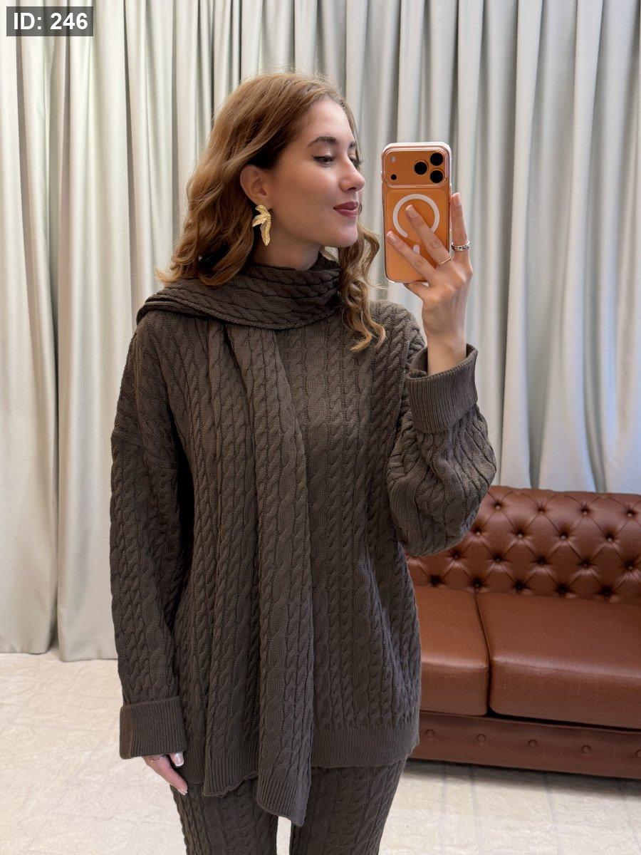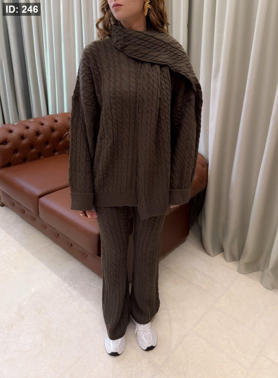 طقم تريكو متكامل بتصميم ضفيرة كلاسيكي أنيق، يتكوّن من كنزة وبنطال مع وشاح متناسق ليمنحك إطلالة شتوية دافئة ومتكاملة. خامته الناعمة وقصّته المريحة تجمع بين الأناقة والراحة، ما يجعله خيارًا مثالياً للإطلالات اليومية الراقية أو الخروجات الشتوية الأنيقة.
